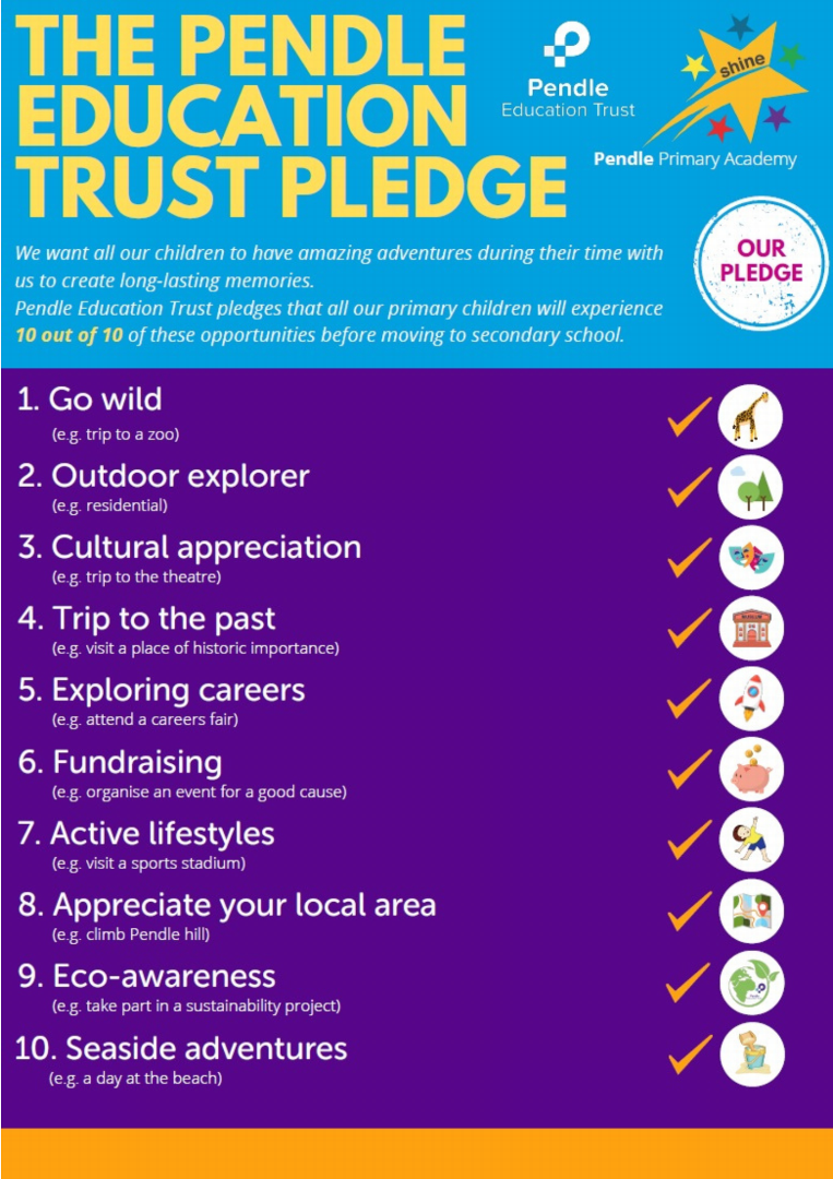 The Pendle Education Trust Pledge - We want all our children to have new experiences during their time with us to create long-lasting memories. We have pledged that all of our primary aged children will experience 10 opportunities before moving to secondary school and our secondary aged children will experience 5 opportunities before moving to college or employment. Opportunities cover cultural appreciation, careers, fundraising, eco-awareness and more. Our children are rewarded with badges and certificates for each achievement from the pledge.