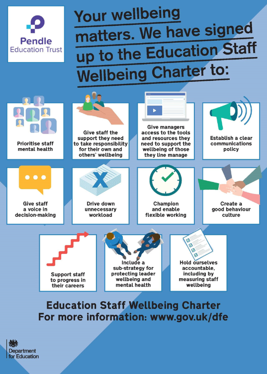 Wellbeing - As a Trust we want to ensure all our staff are supported and feel valued. We have developed new Health and Wellbeing and Recognition policies to formally outline the Trust’s commitment to staff health and wellbeing. We hold a summer social event for staff and Shine Awards are presented throughout the academic year. We have a fantastic group of health and wellbeing champions who’s aim is to improve staff wellbeing at work and home. Many of these recently completed a Level 2 Mental Health in the Workplace qualification to support their colleagues. All of our staff can access a 24/7 Mindful Employer helpline if they need to speak to someone about their mental health and wellbeing and all staff have access to the Vivup online platform which offers a range of employee benefits. All Pendle Education Trust schools have signed up to the Governments Education staff wellbeing charter.This charter has given the Champions a format to follow to ensure the priorities are discussed and new initiatives are put in place to support all staff within the Pendle Education Trust family.